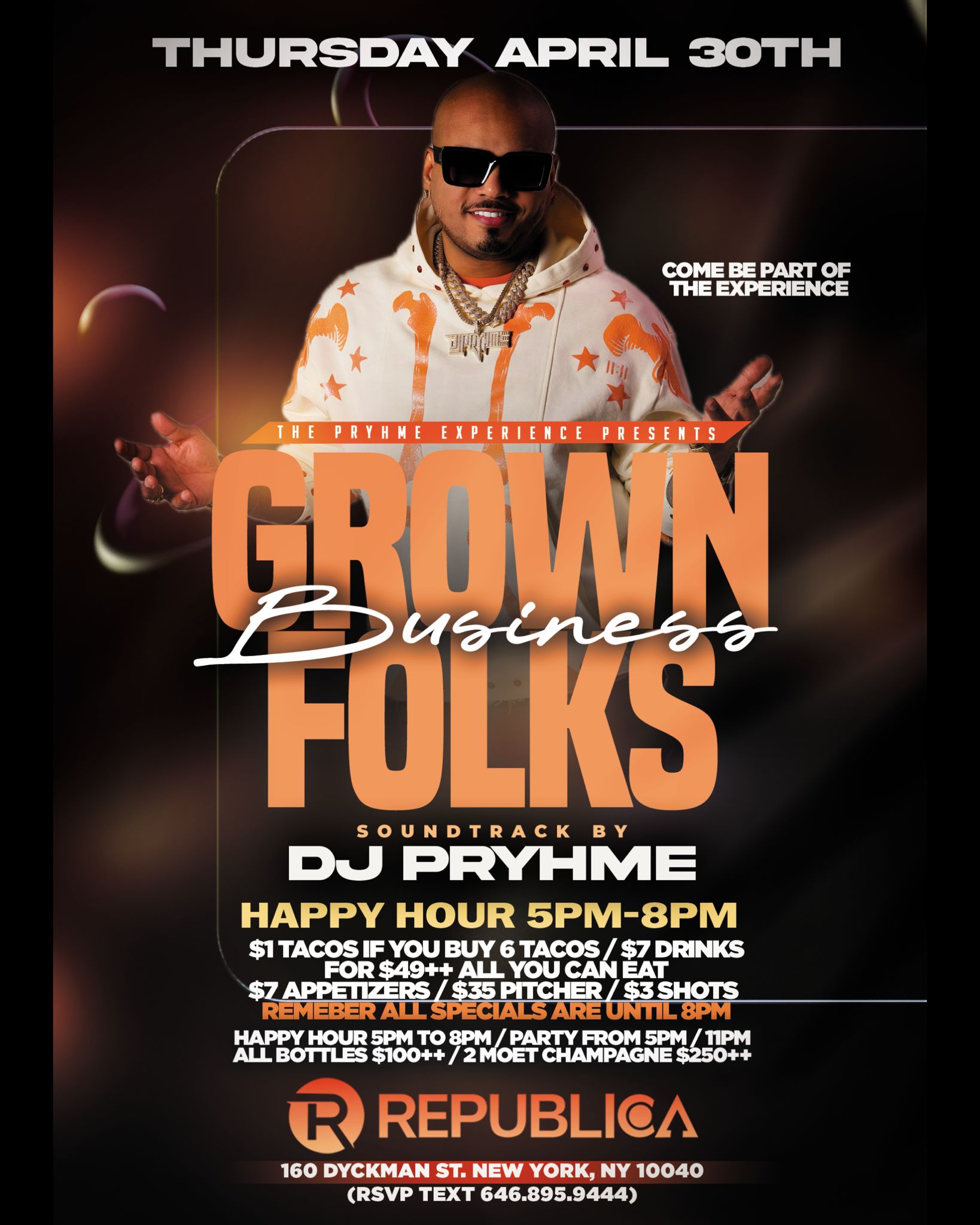 Republica Restaurant & Lounge in Uptown Manhattan features three spacious floors, a vibrant rooftop bar, a stylish lounge, and flexible space for private parties and events. Join us for dinner, brunch, happy hour, handcrafted cocktails, and bold Latin-inspired cuisine on Dyckman Street. With weekly events, live DJs, bottle service, and rooftop dining, Republica is a go-to destination for nightlife and private events in Upper Manhattan. Visit us at 160 Dyckman St, New York, NY 10040, or call 646-895-9444
